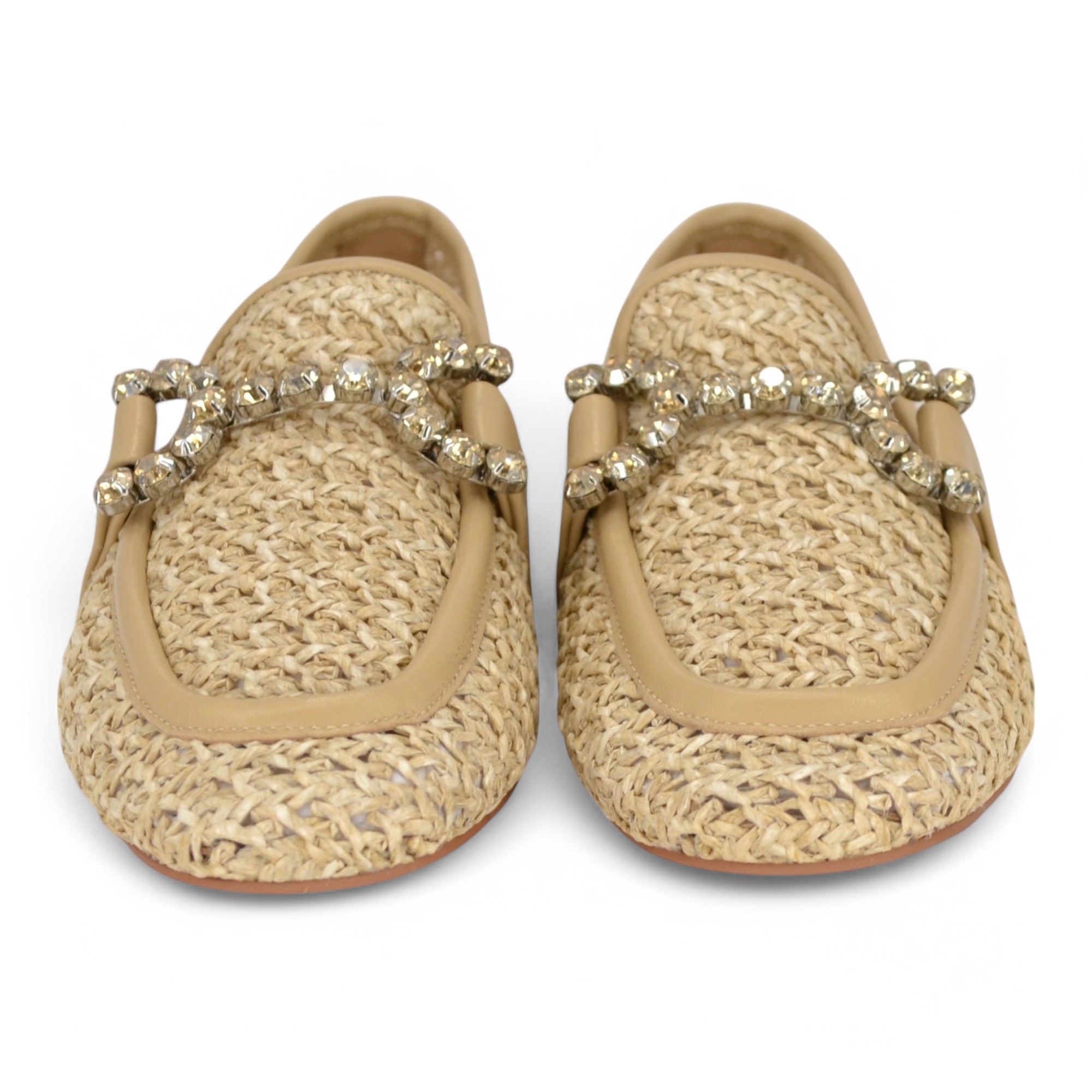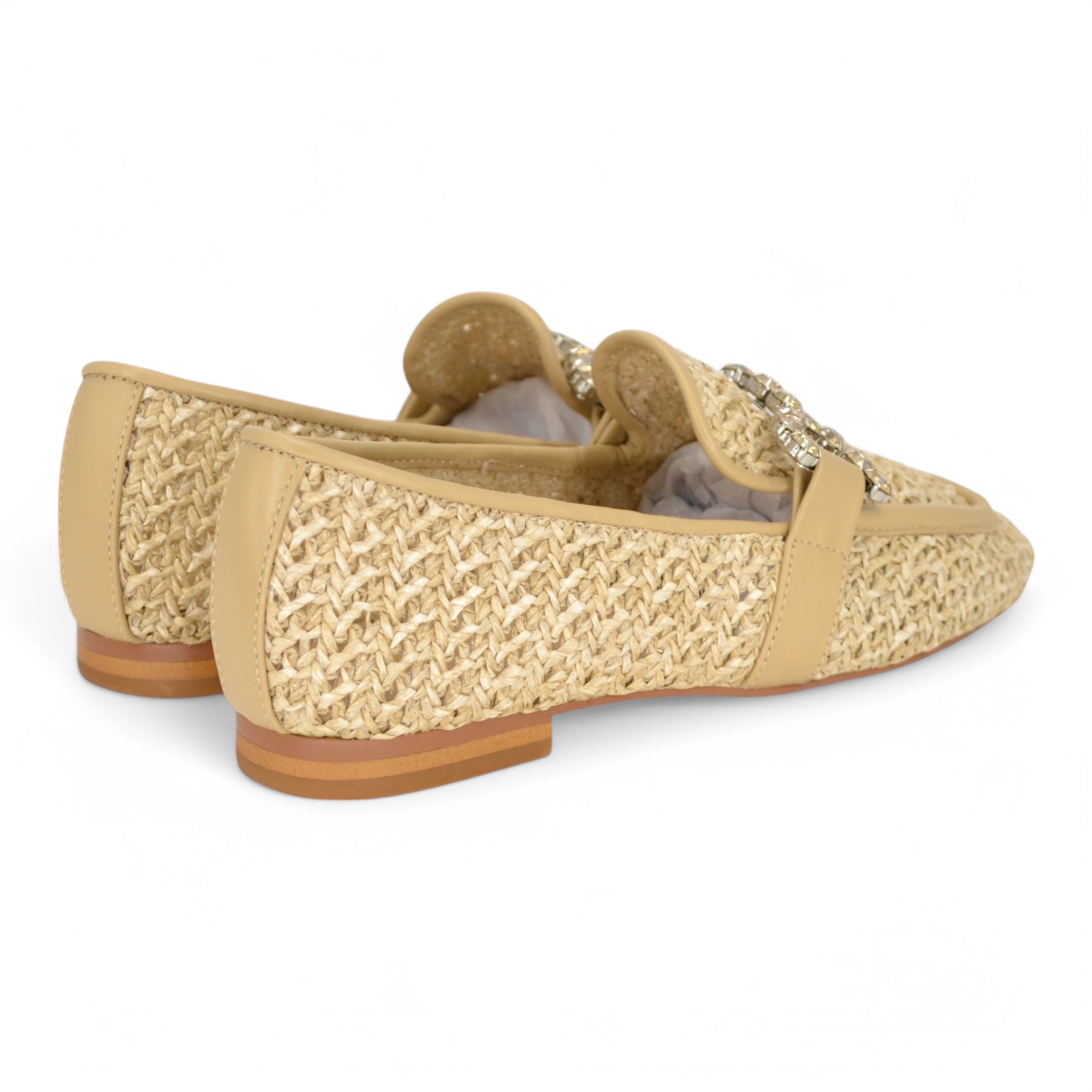 Mocassino in corda intrecciata, accessorio in acciaio dorato con pietre, sottopiede imbottito in pelle, suola in cuoio, altezza tacco cm.2,5.
