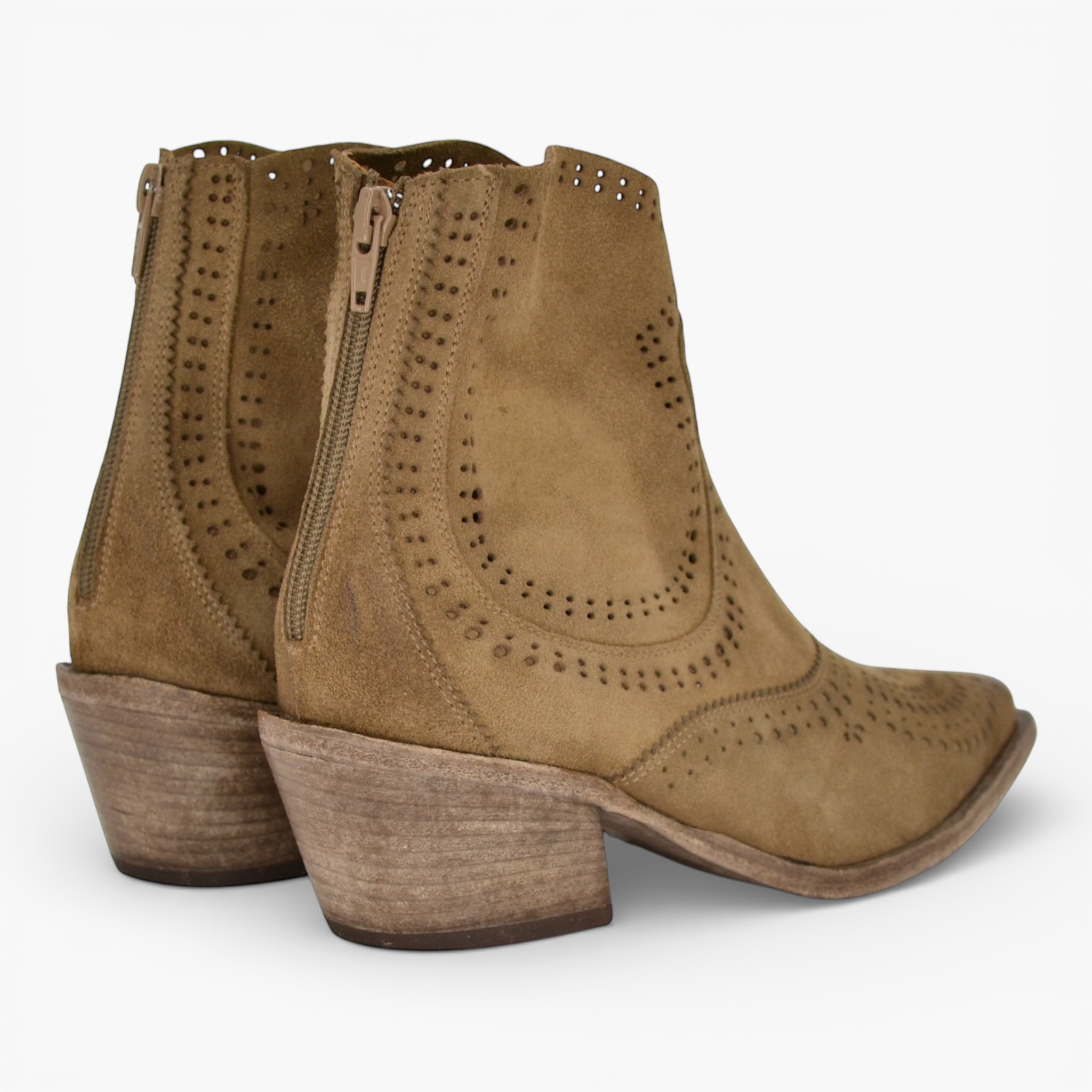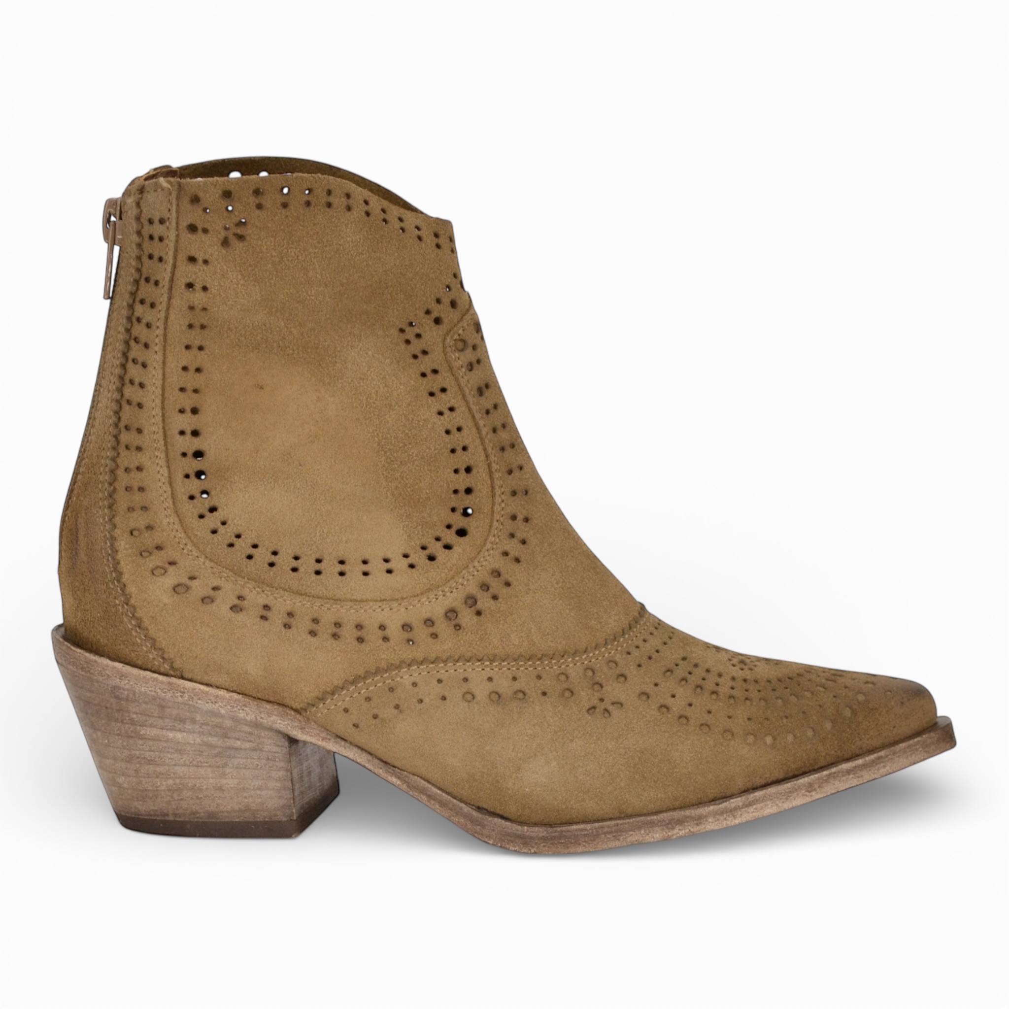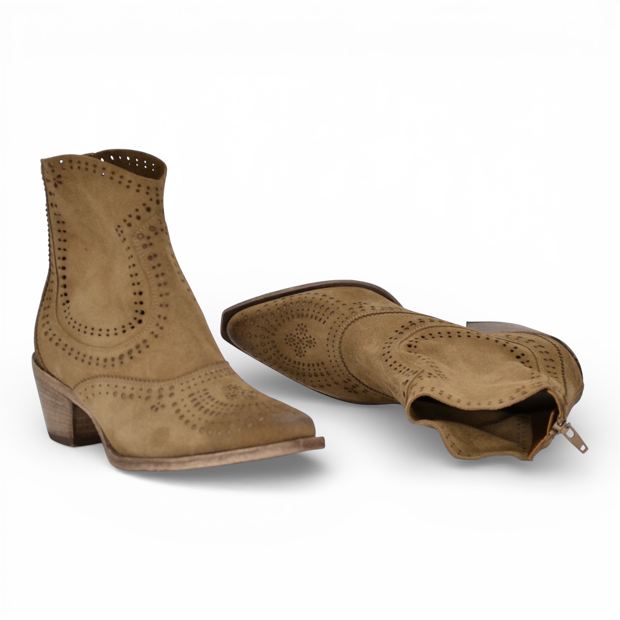 Tomaia in camoscio laserato, fodera interna in pelle, sottopiede in pelle, zip posteriore all'interno, suola in cuoio, altezza tacco cm.6.