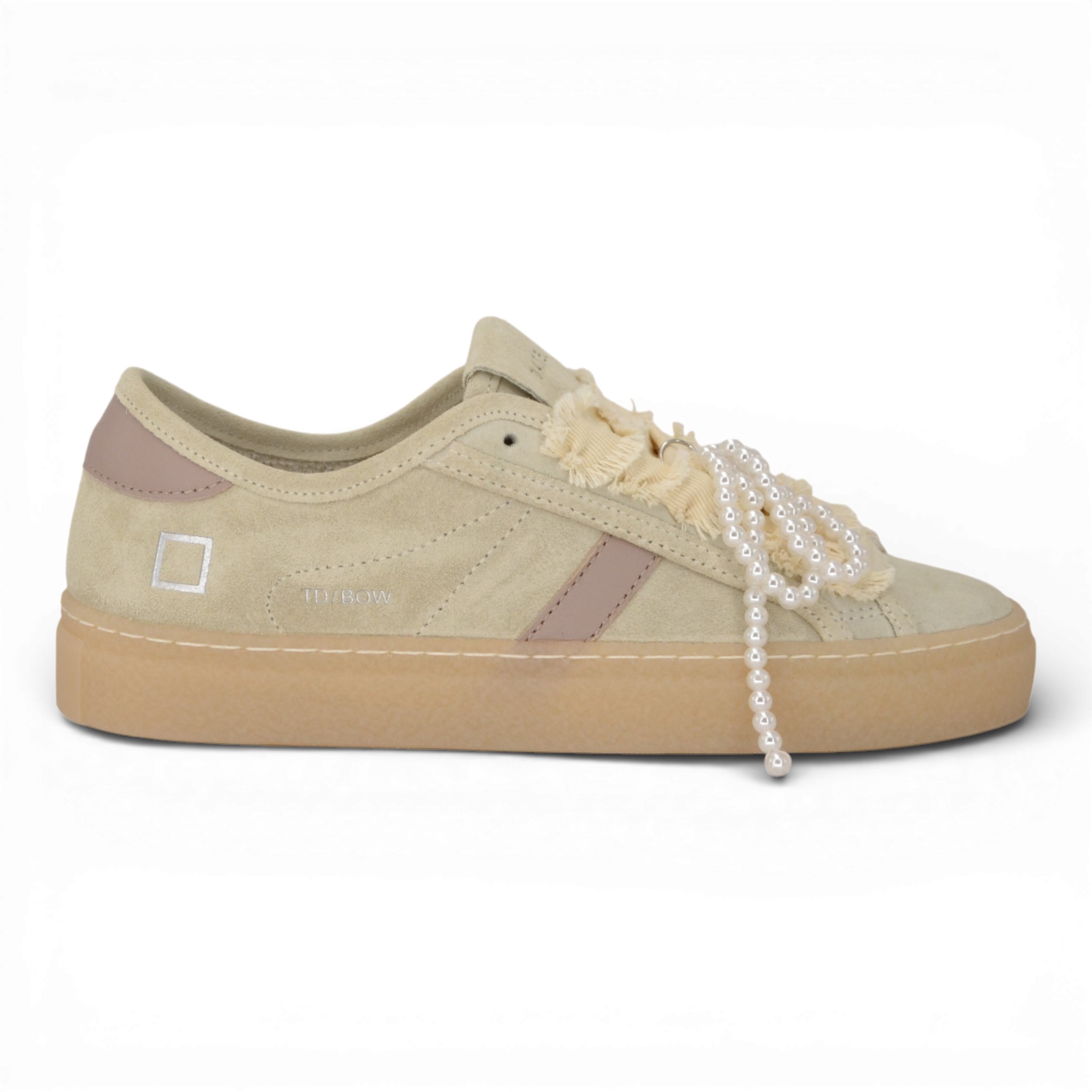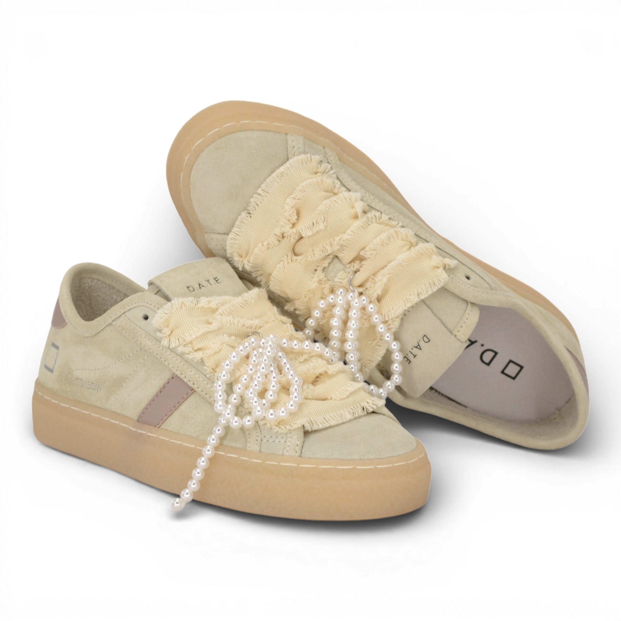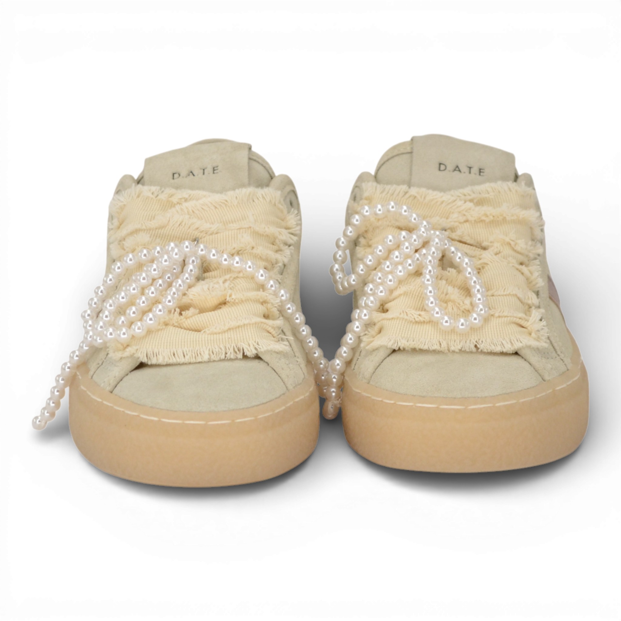 Tomaia in camoscio effetto vintage, fodera interna in morbida spugna, laccio in lino con catenina in perle, plantare rialzato estraibile, suola in gomma, altezza tacco cm.3,5.
