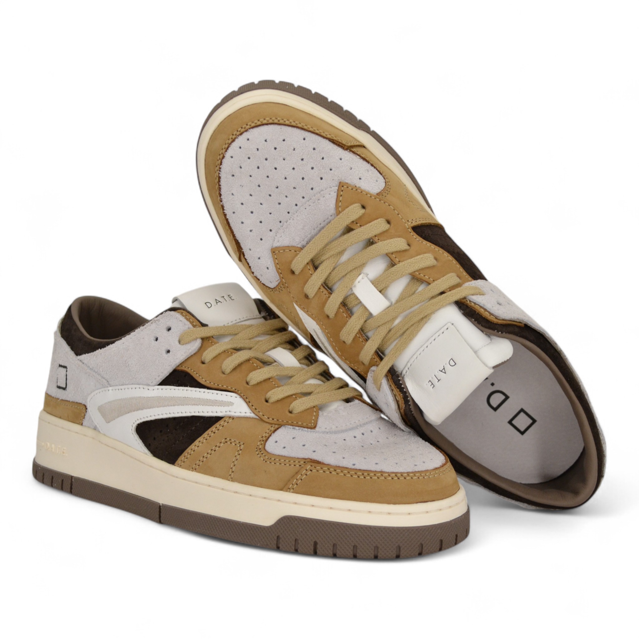 Tomaia in camoscio, linguetta in nabuk, fodera interna in spugna, suoletta interna rialzata estraibile, fondo a cassetta in gomma, altezza tacco cm.3,5.