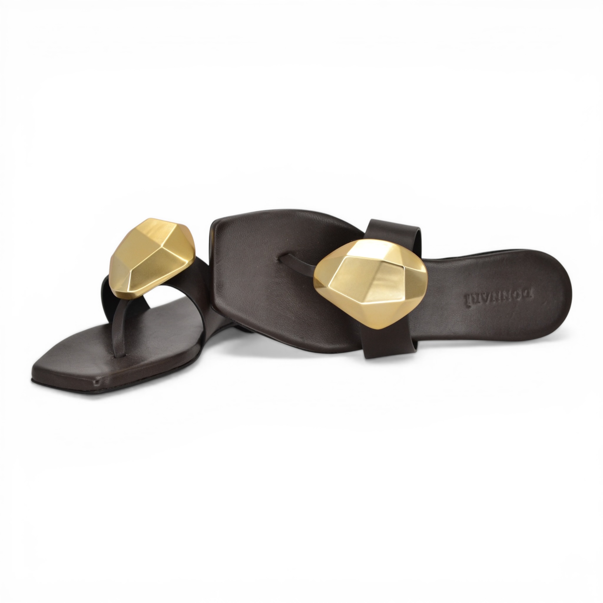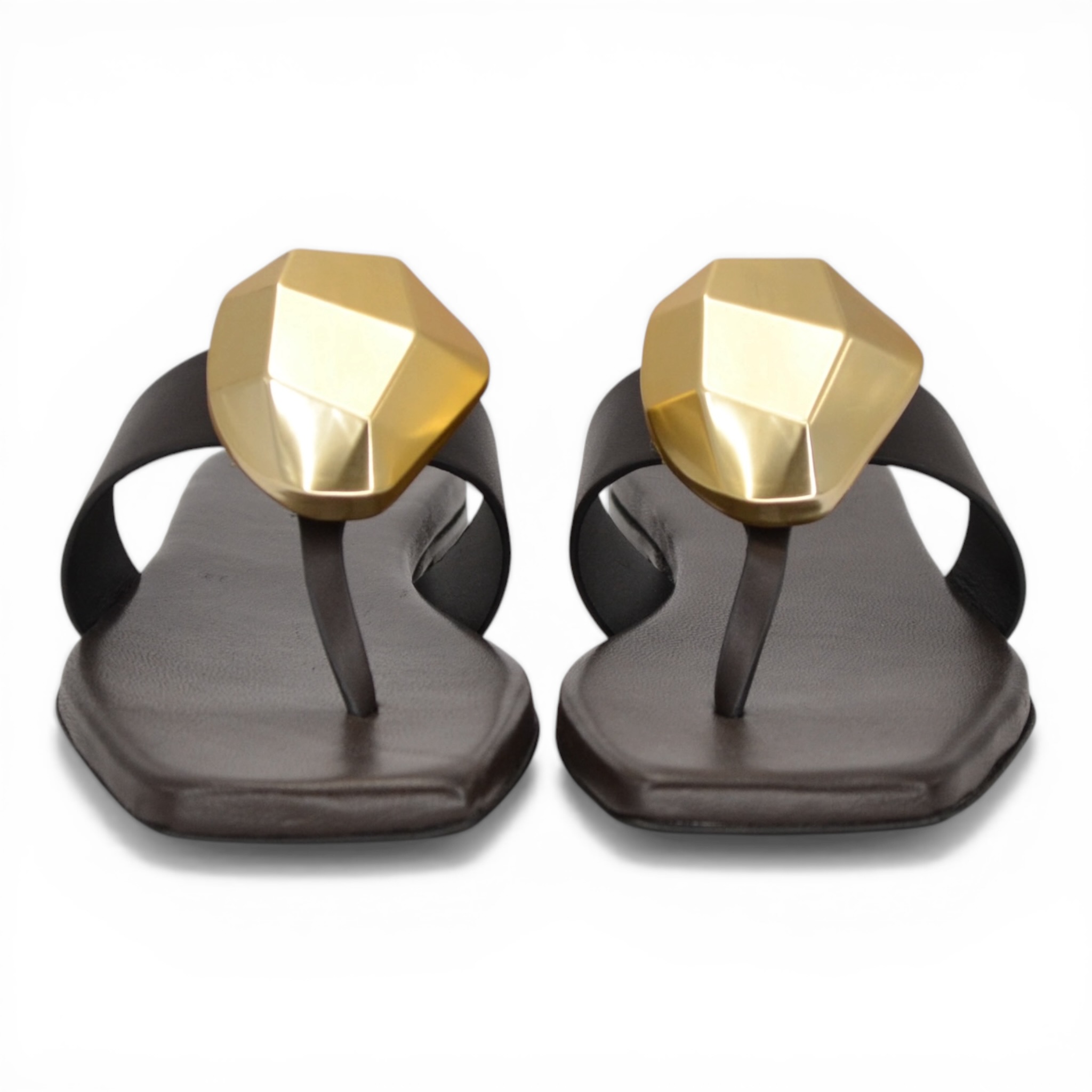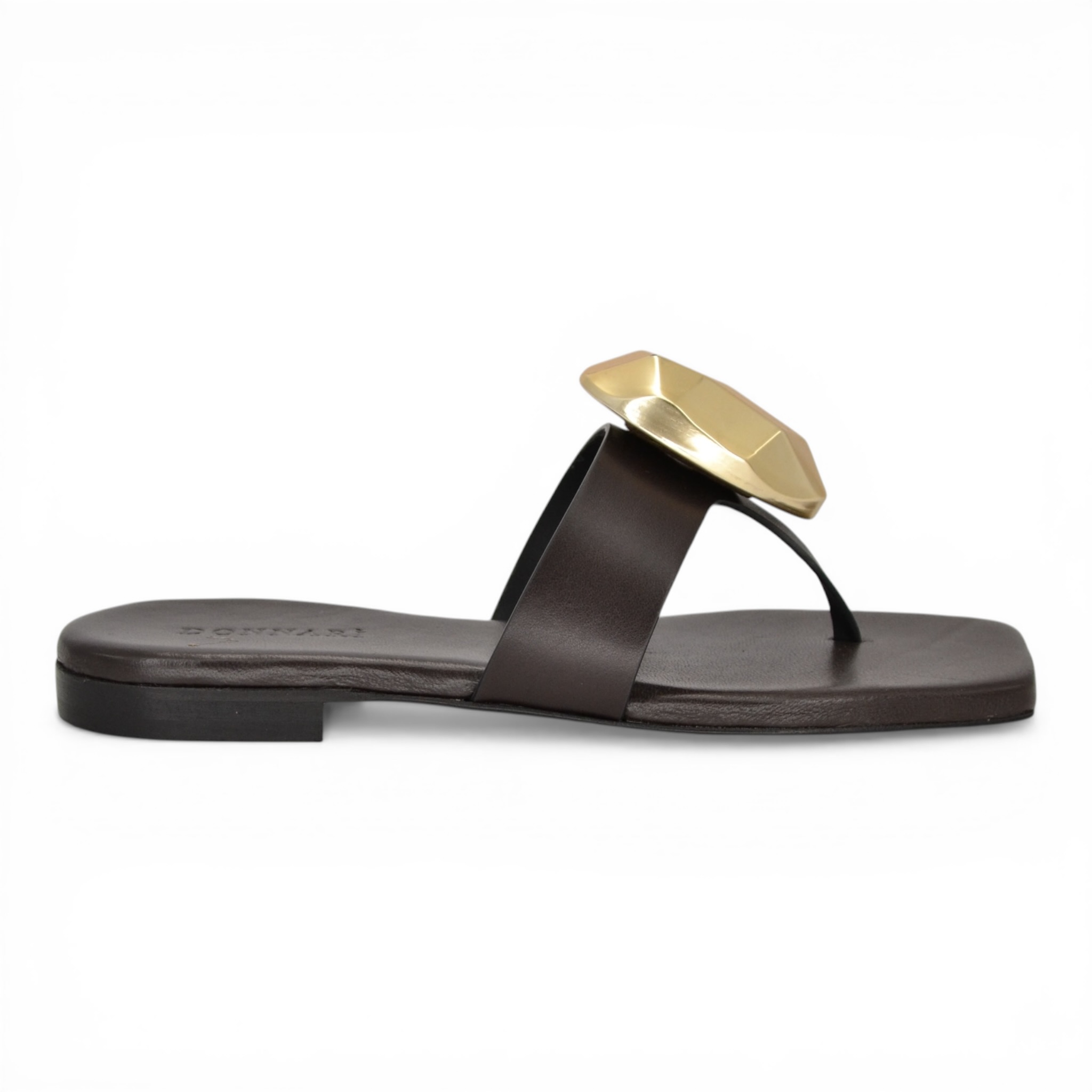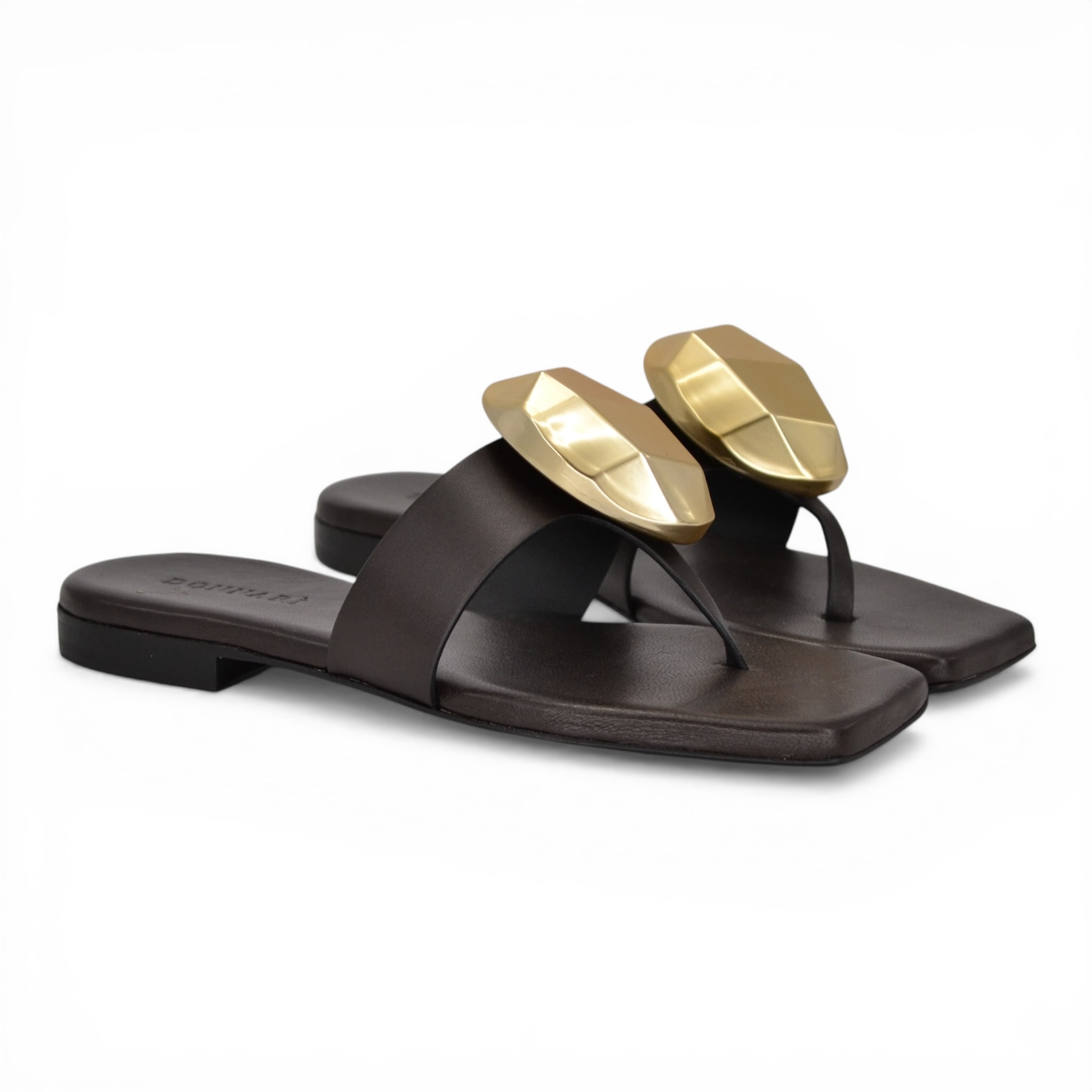 Tomaia in pelle laminata, infradito accessorio dorato, sottopiede imbottito in pelle, suola in cuoio, altezza tacco cm.2.