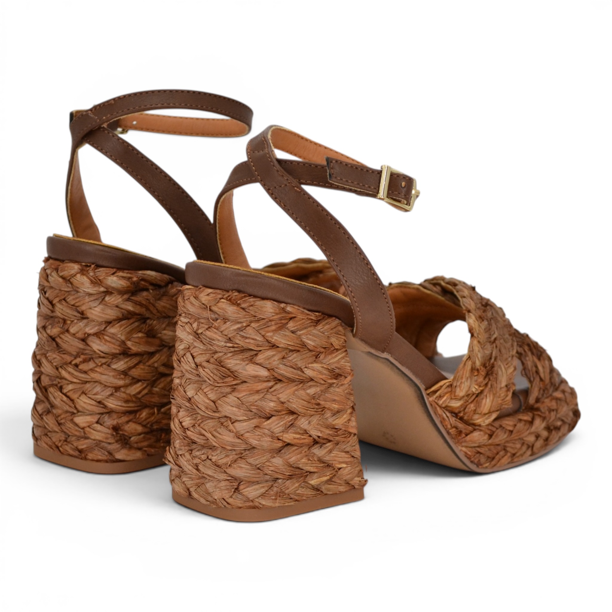 Tomaia in rafia, fodera interna e sottopiede in pelle, suola in gomma, altezza platform cm.3, altezza tacco cm.10