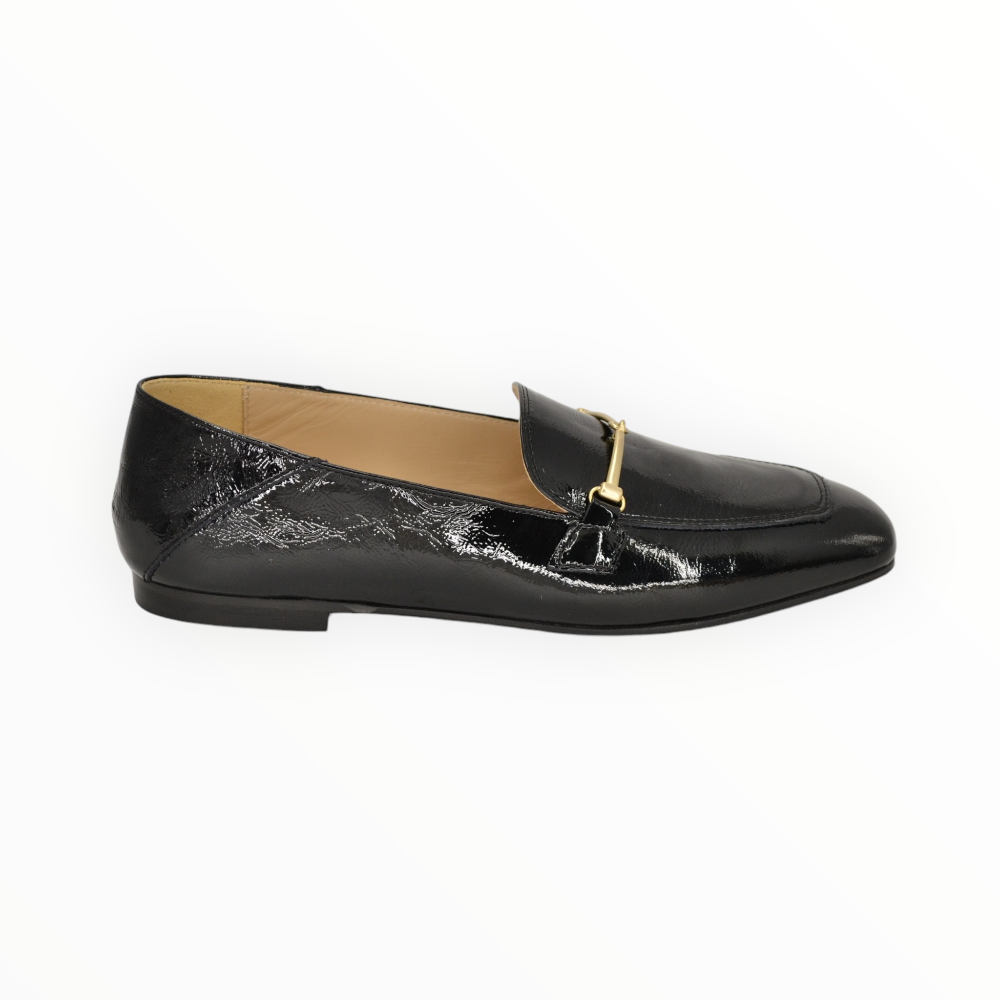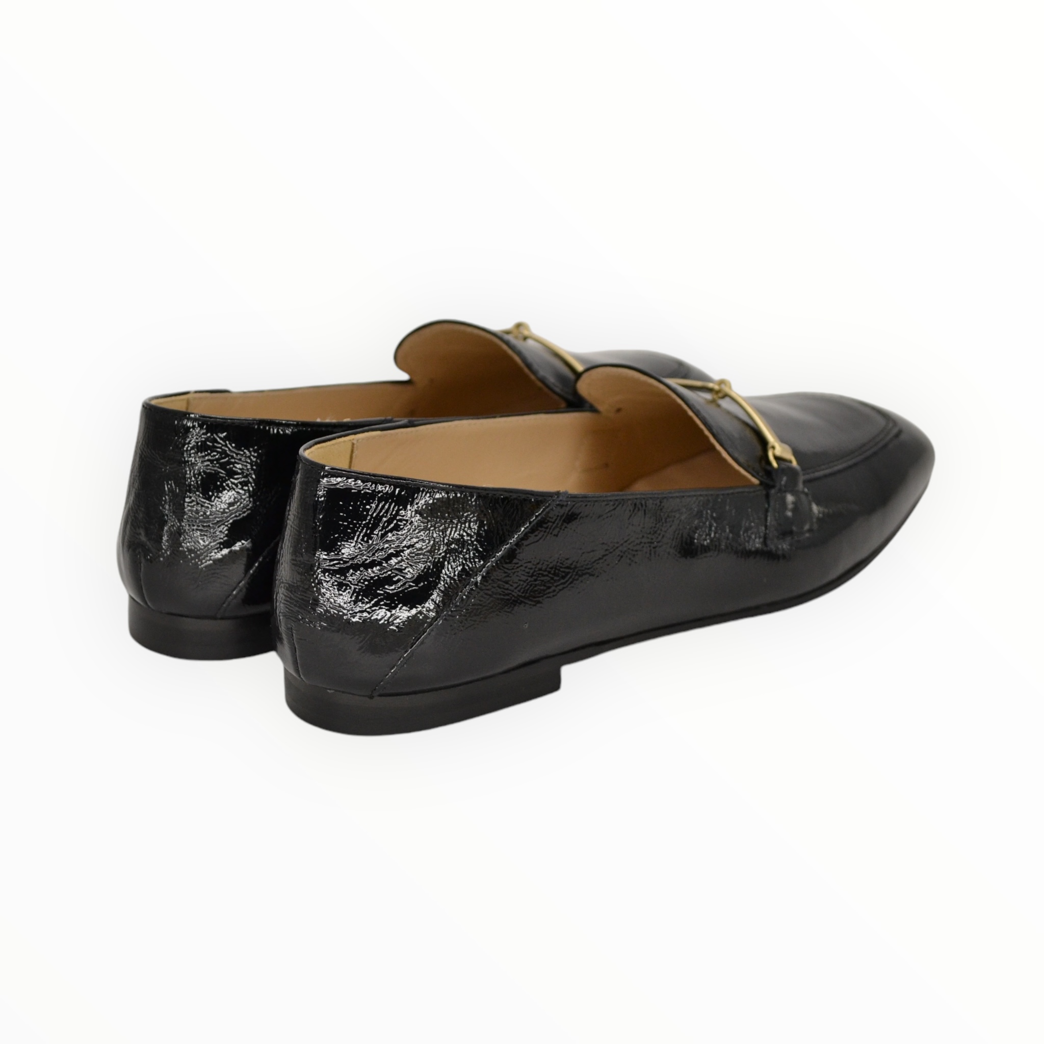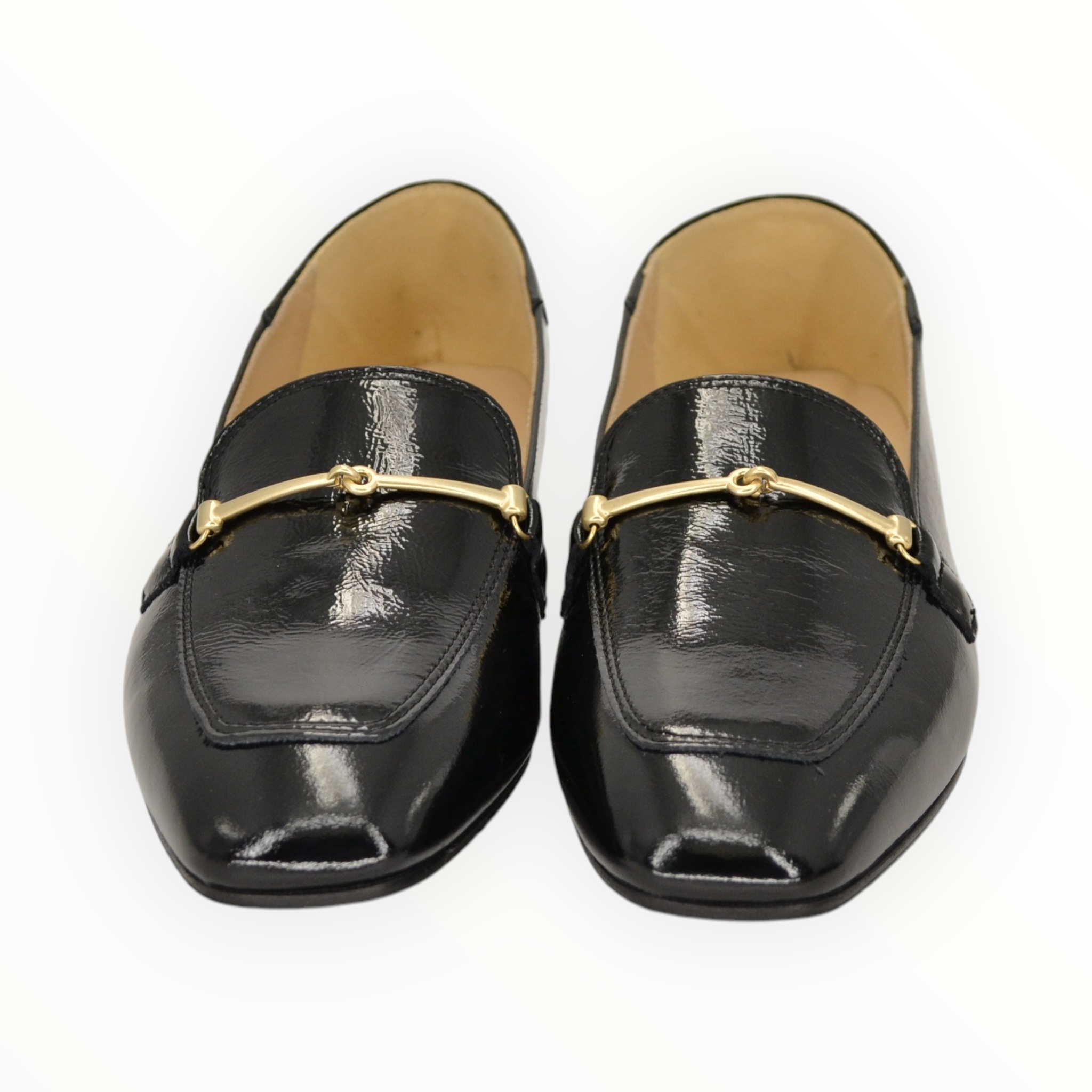 Tomaia in naplak, fodera interna e sottopiede in pelle, accessorio acciaio, suola in cuoio, altezza tacco cm.2.