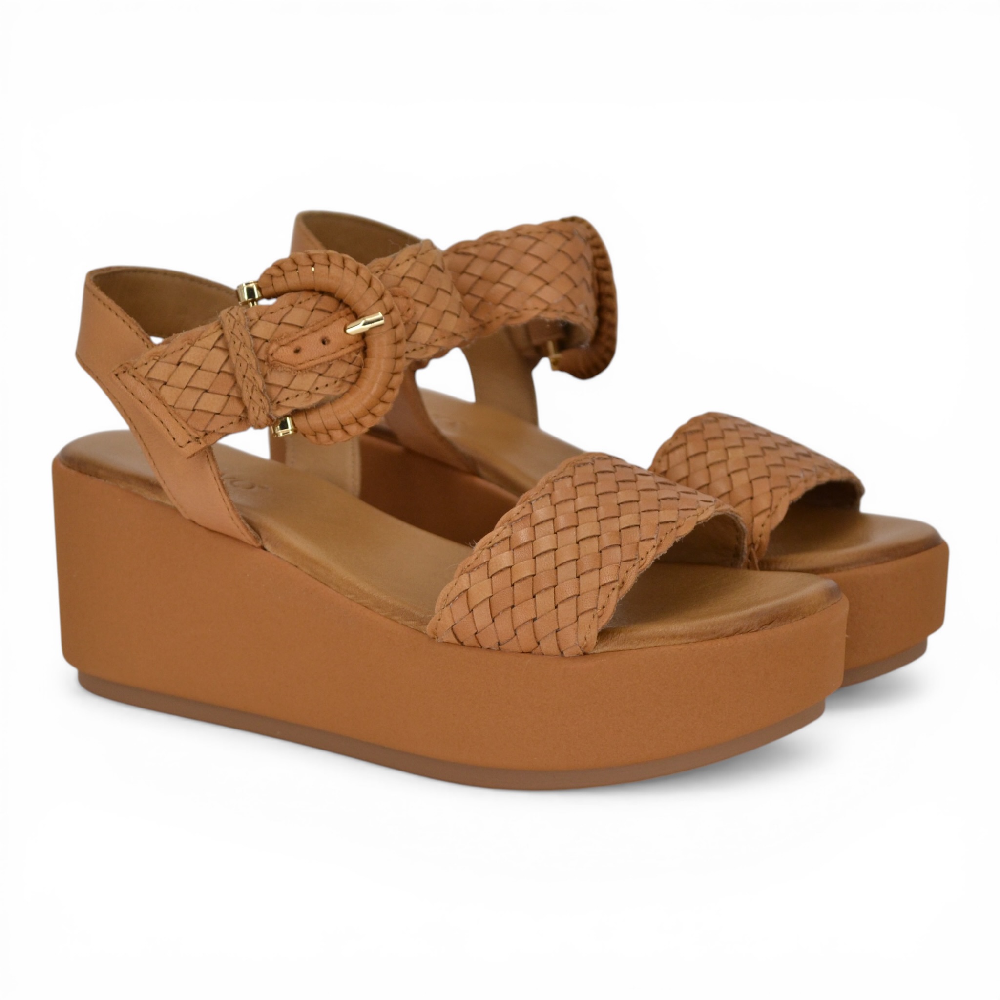 Tomaia intrecciata in pelle, fodera interna in pelle, sottopiede imbottito in pelle, fondo in gomma alezza zeppina cm.7