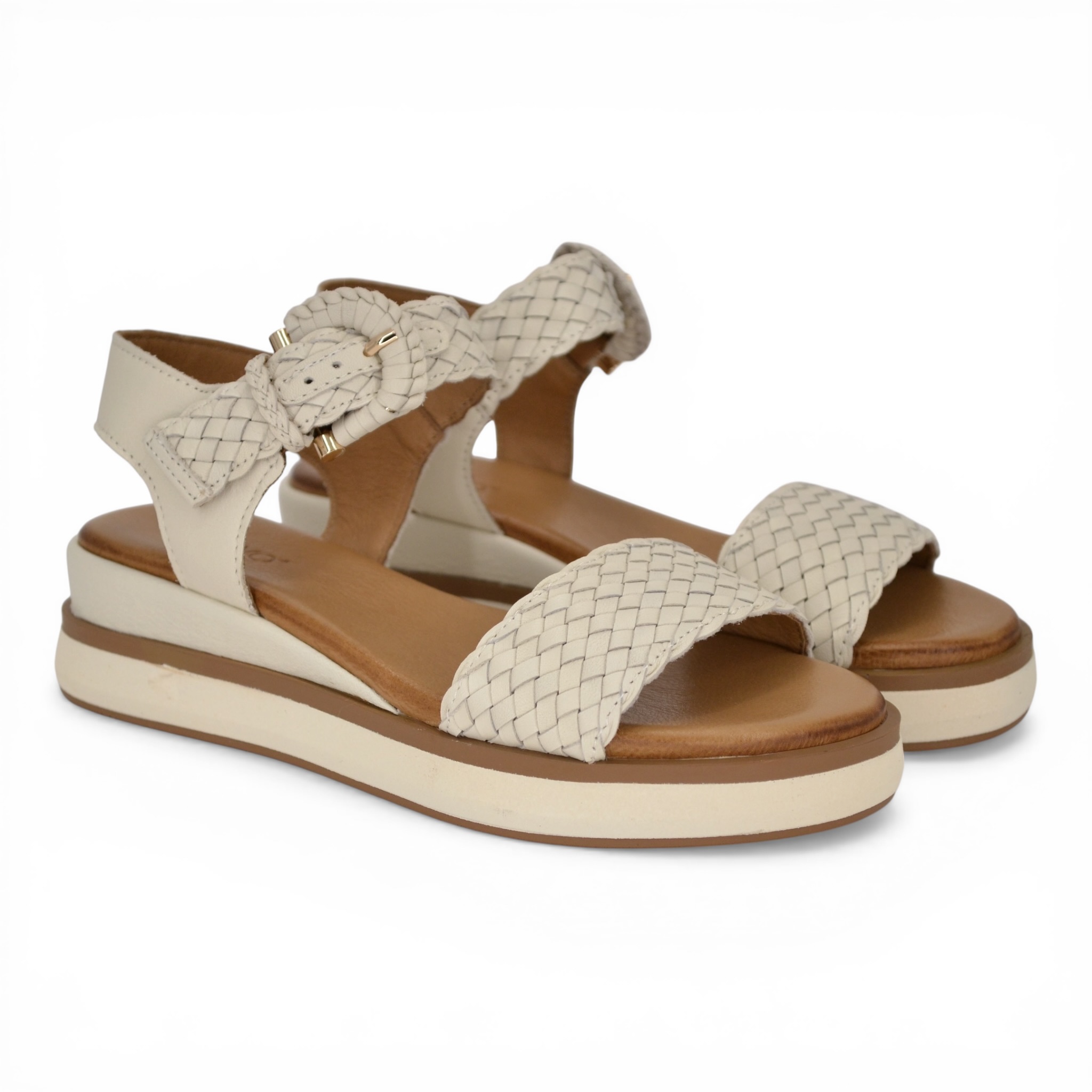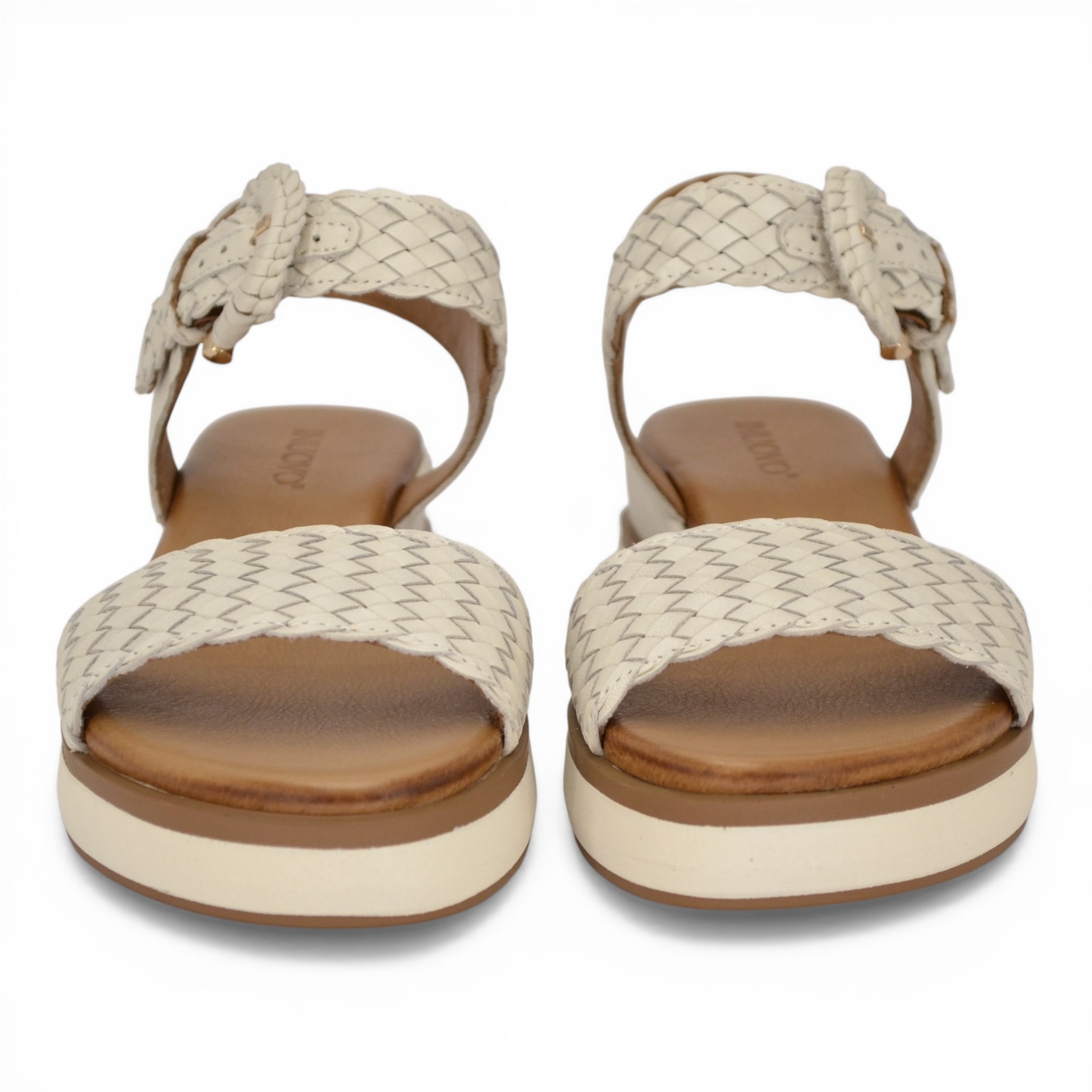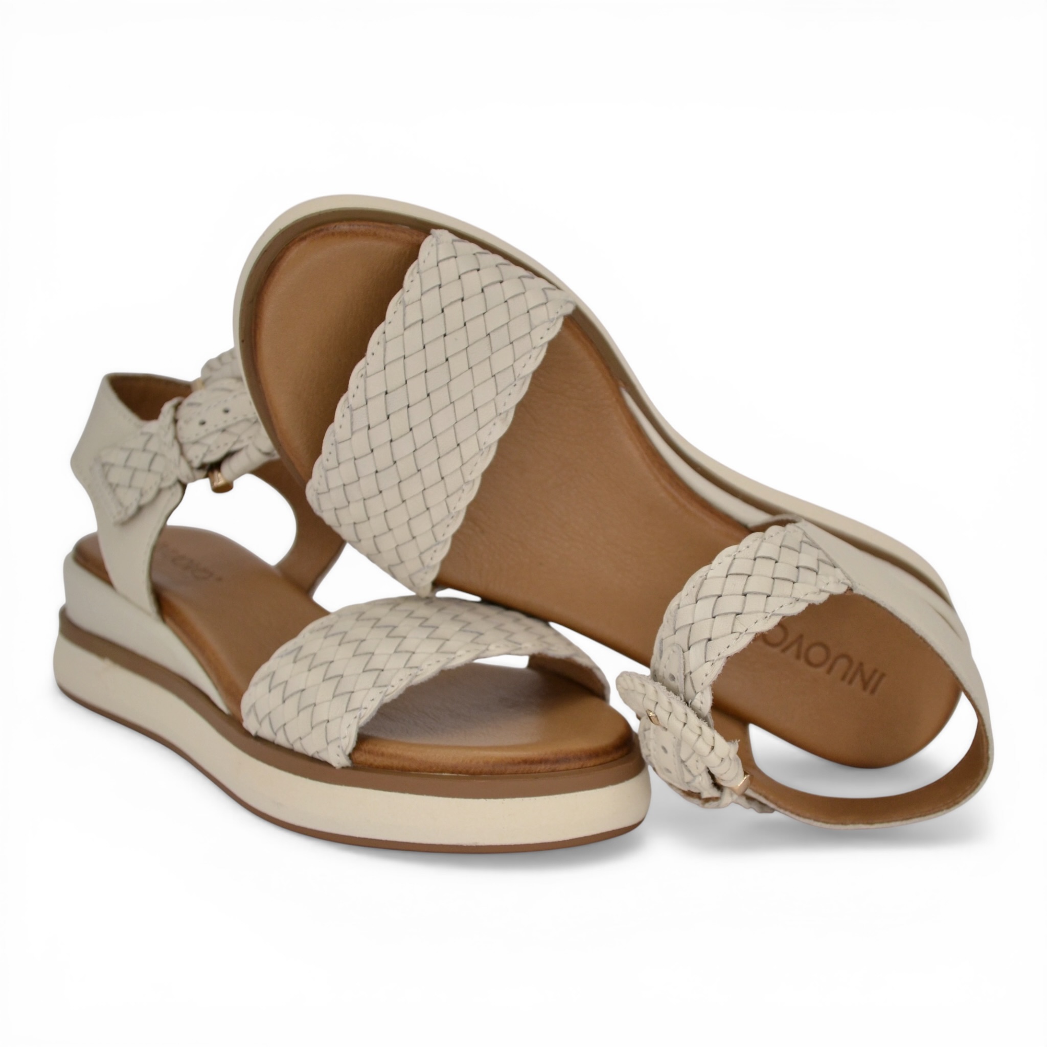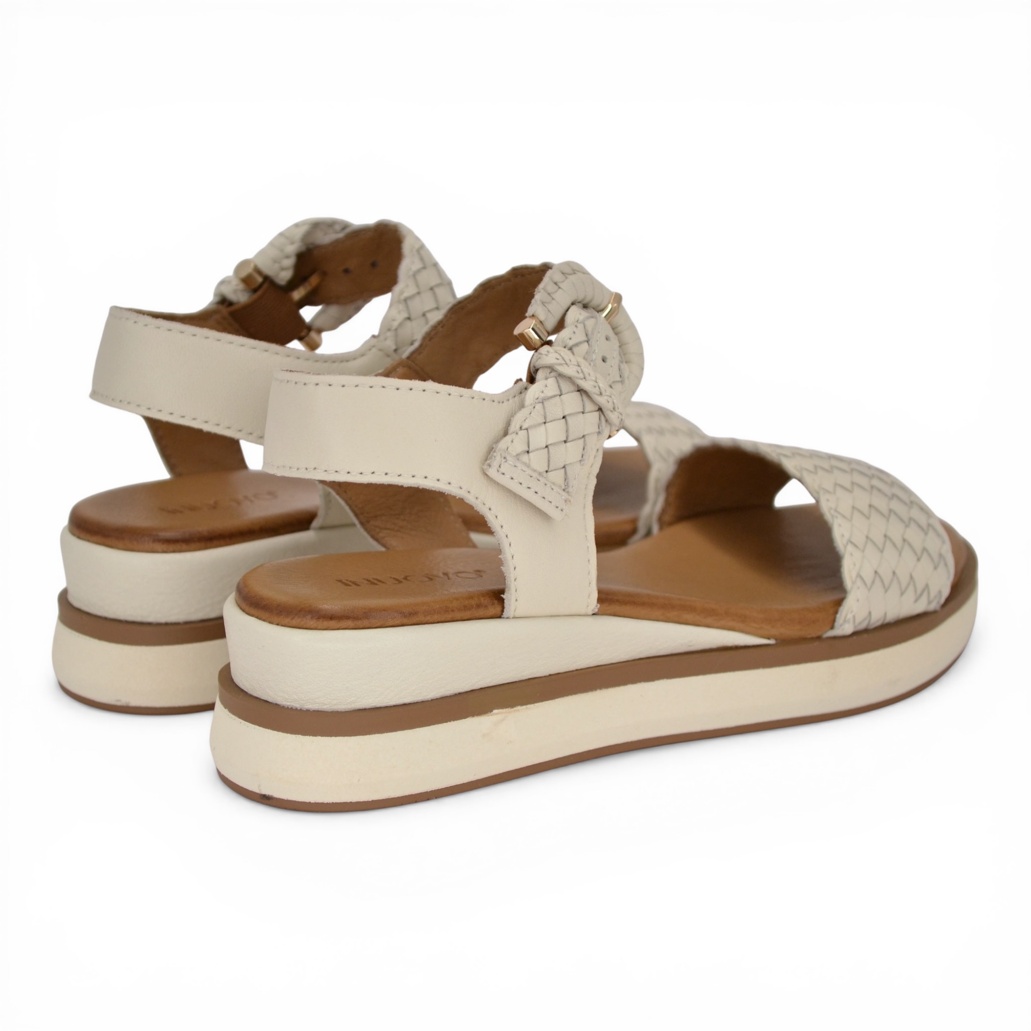 Tomaia intrecciata in pelle, fodera interna in pelle, sottopiede imbottito in pelle, fondo in gomma alezza zeppina cm.5