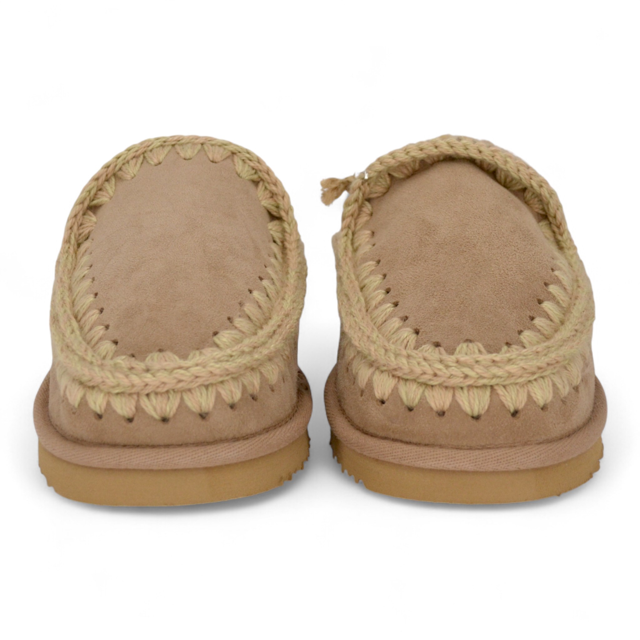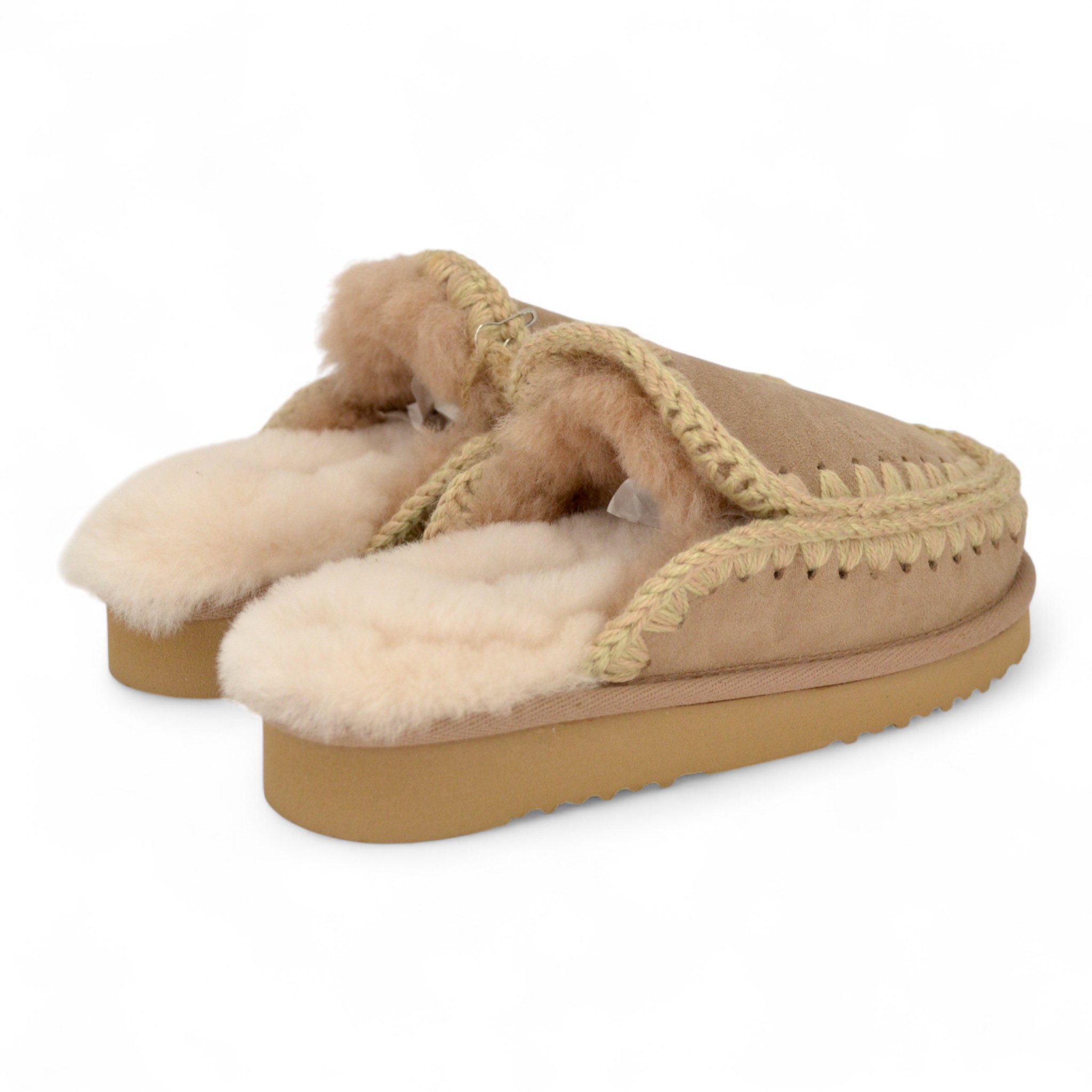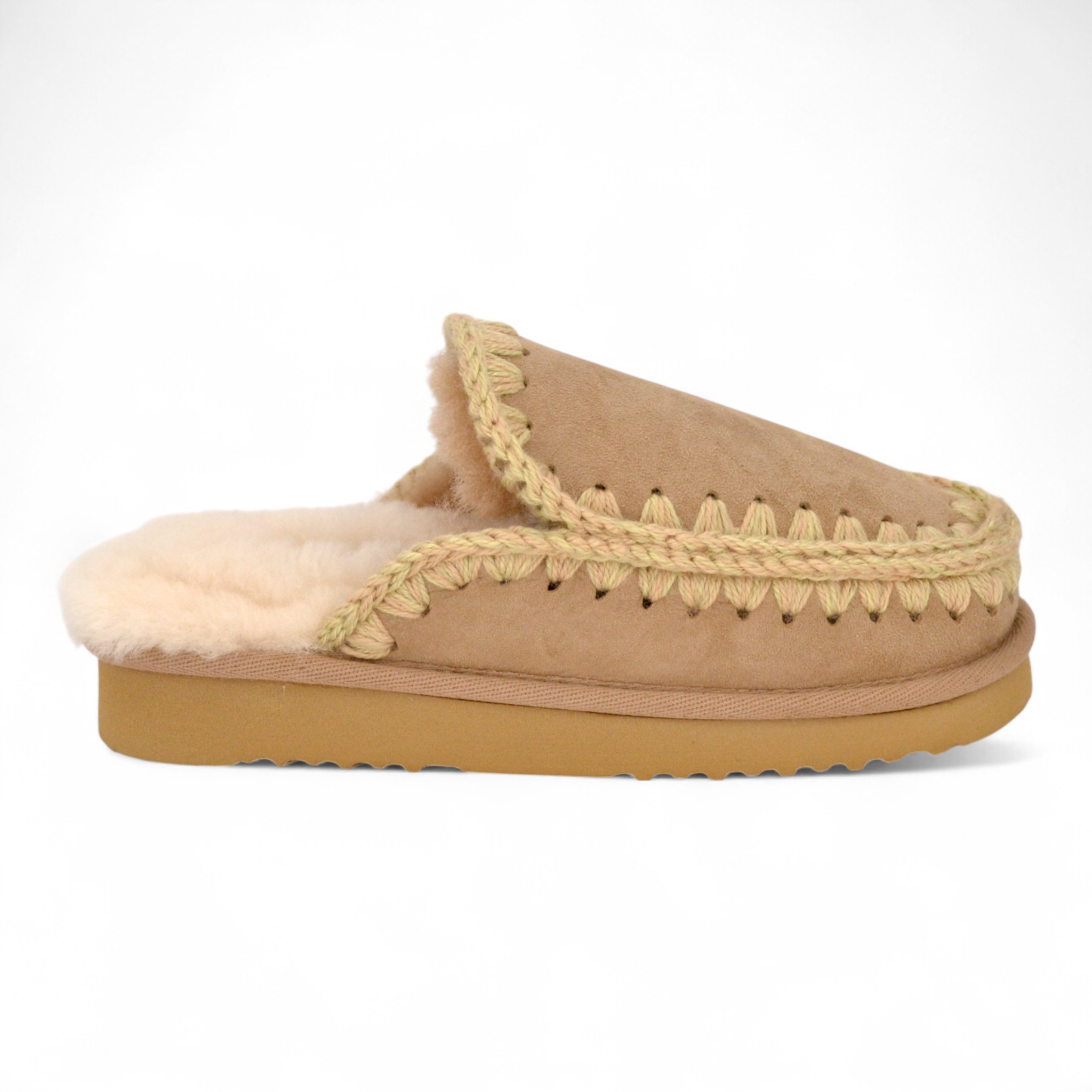 Tomaia in splendido e caldo montone double-face, con cuciture in lana lavorate all'uncinetto, tallone rinforzato e una resistente suola esterna in EVA e gomma.