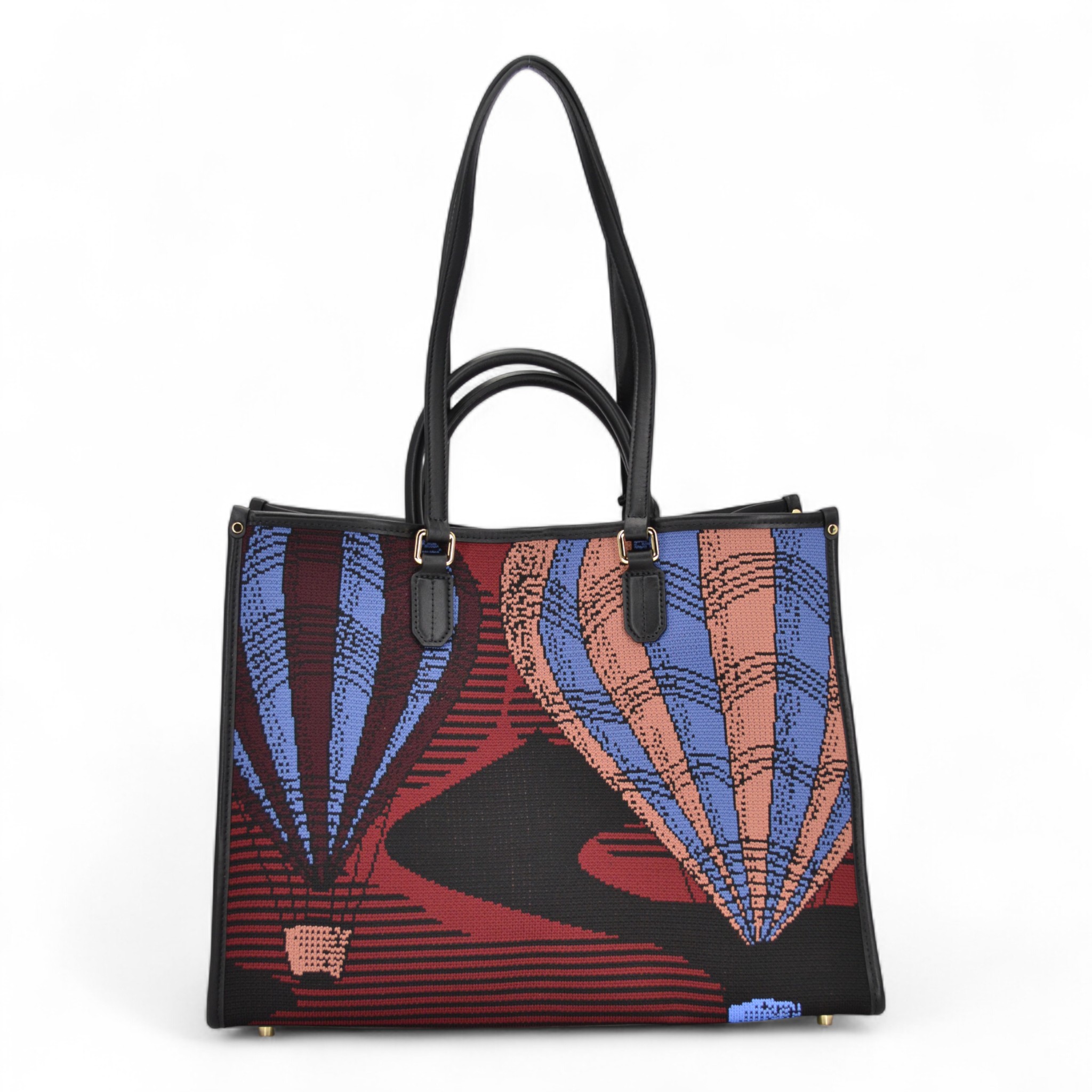 Borsa in tessuto con stampa cucita, interno in tessuto con profili e manici in pelle, tracolla interna in velluto da usare anche separatamente, misure: cm 37 x 30 x 15.