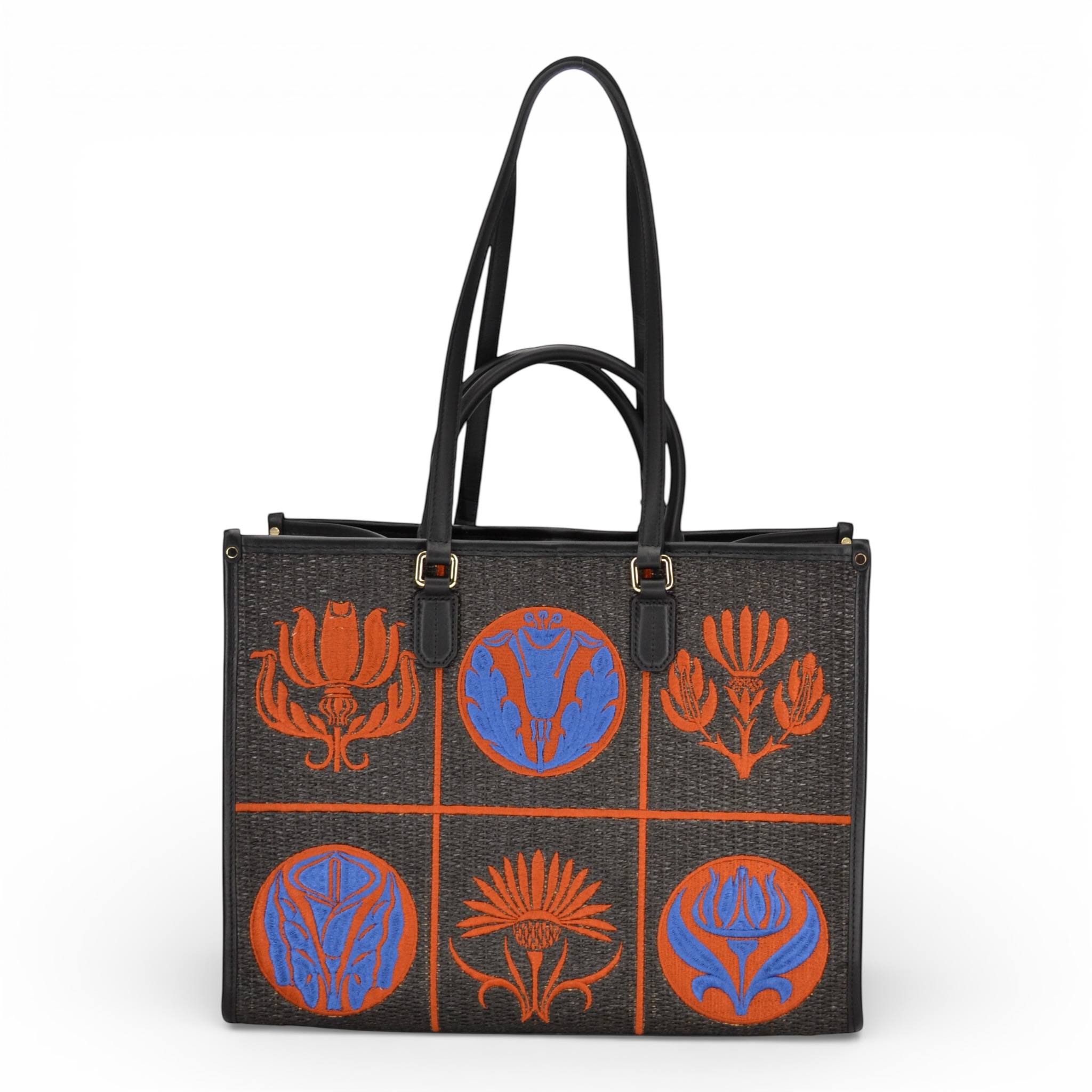 Borsa in paglia intrecciata, profili e manici in pelle, all'interno capiente sacca in tessuto dotata di tracolla in pelle regolabile che diventa una comoda tracolla, misure: 38x31x16 cm.