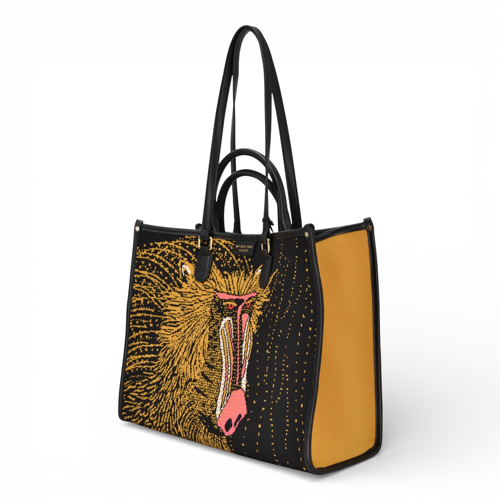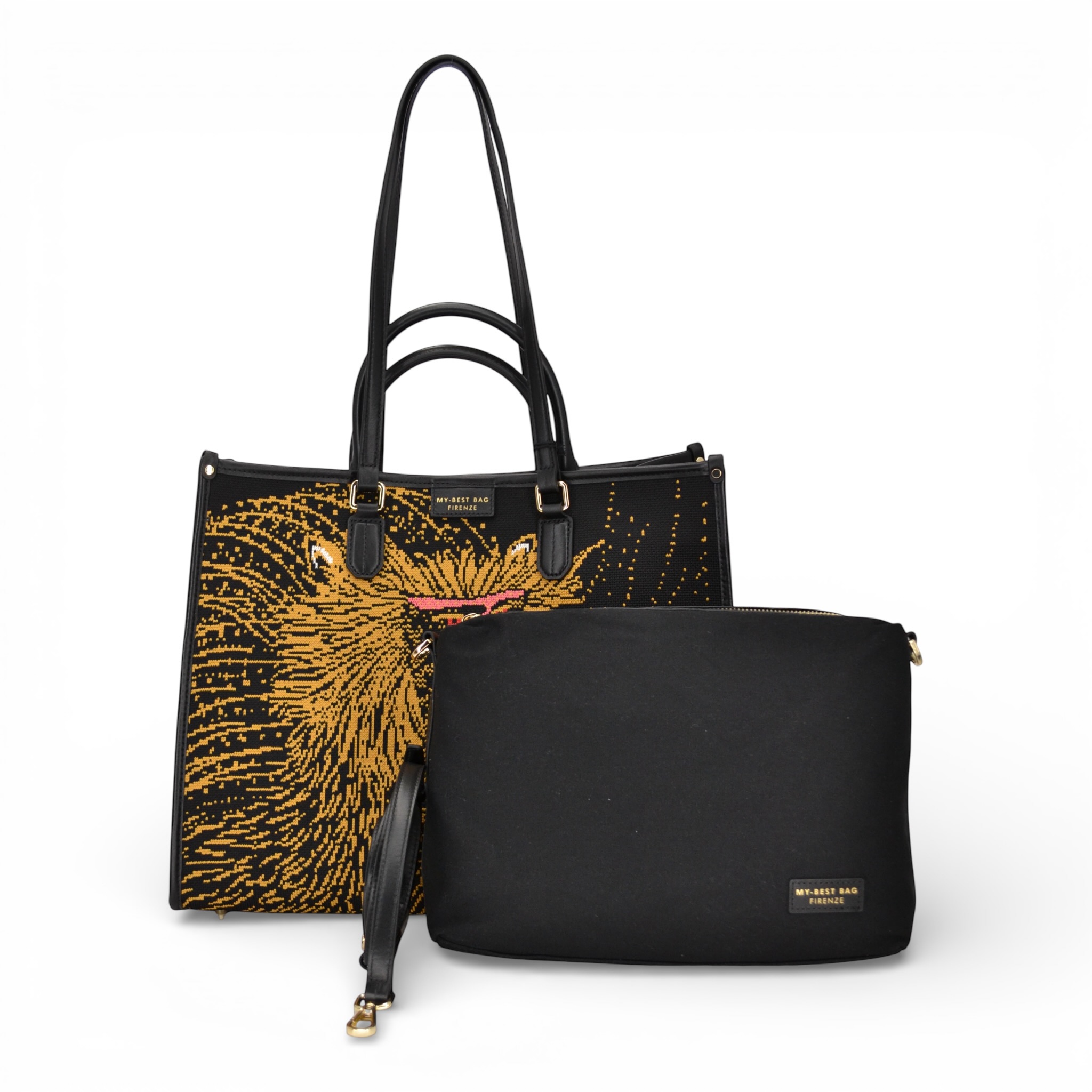 Borsa in tessuto sfoderato, profili e manici in pelle, all'interno capiente sacca in tessuto dotata di tracolla in pelle regolabile che diventa una comoda tracolla, misure: 38x31x16 cm.