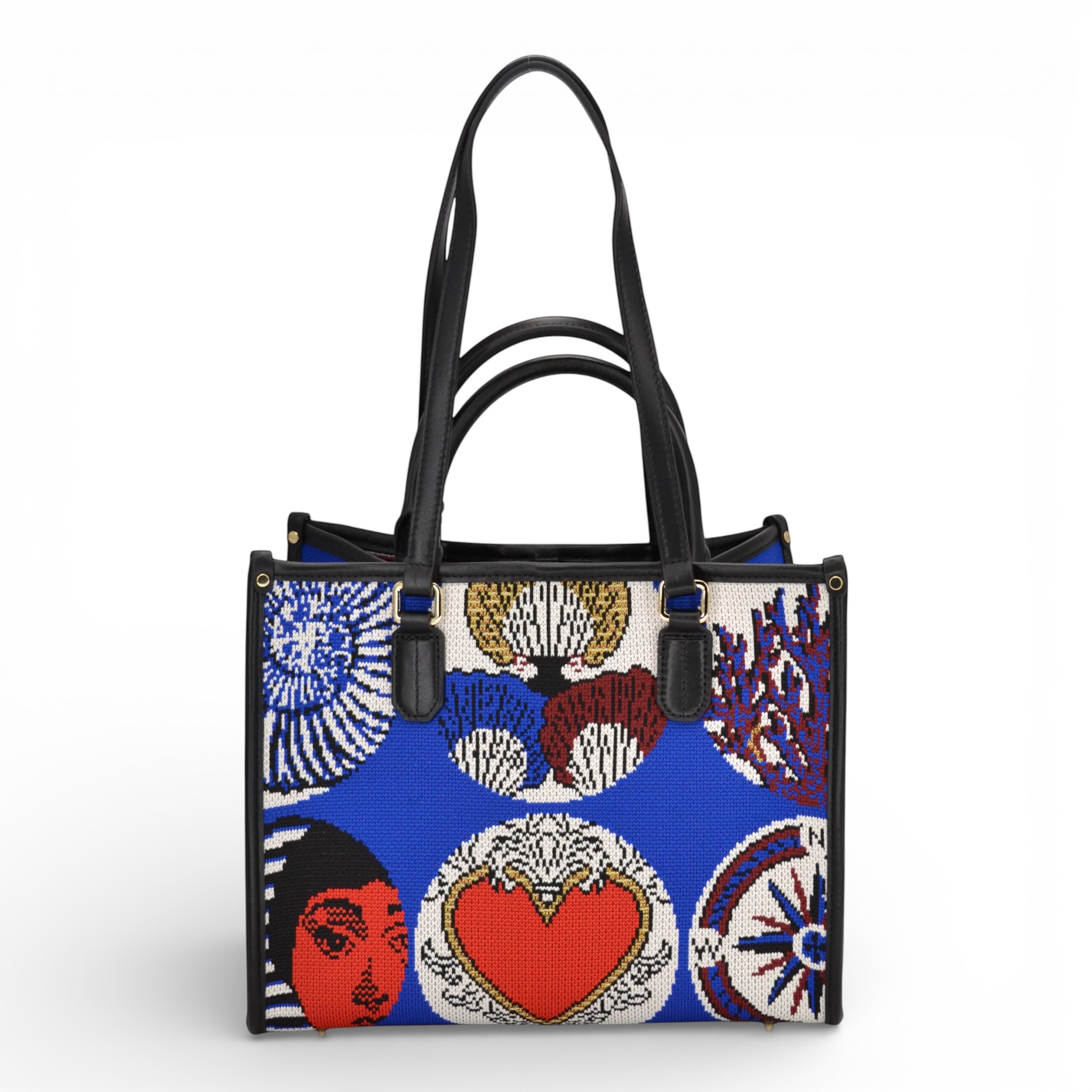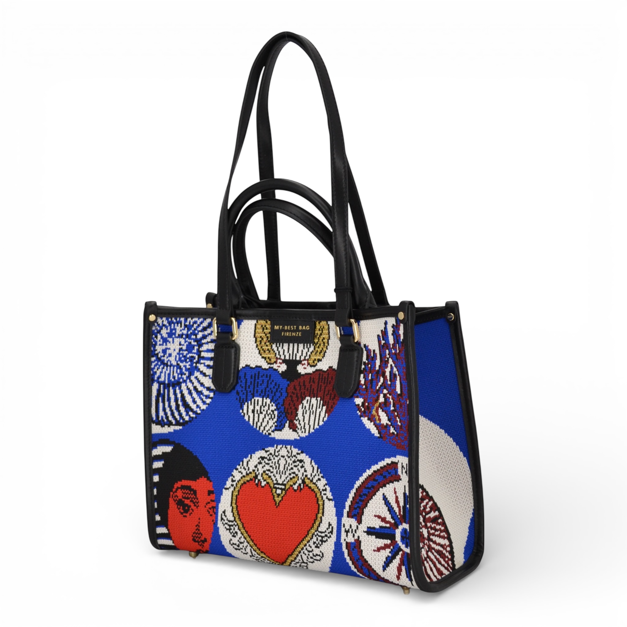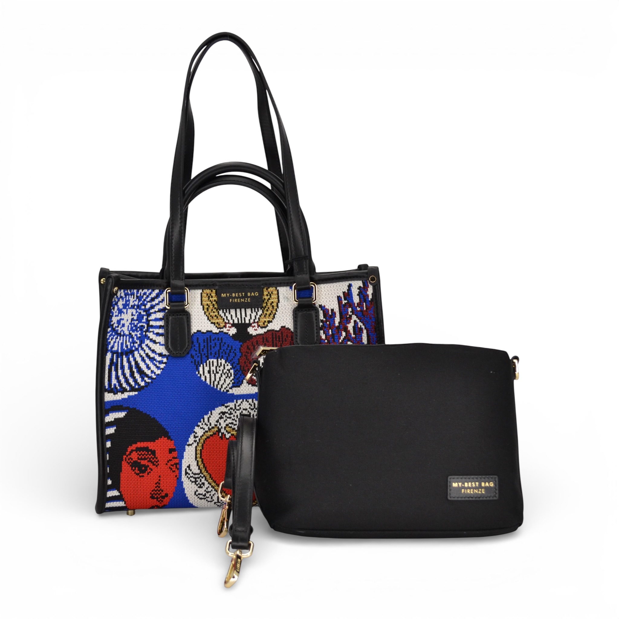 Borsa in tessuto, profili e manici in pelle, all'interno capiente sacca in tessuto dotata di tracolla in pelle regolabile che diventa una comoda tracolla, misure: 38x31x16 cm.