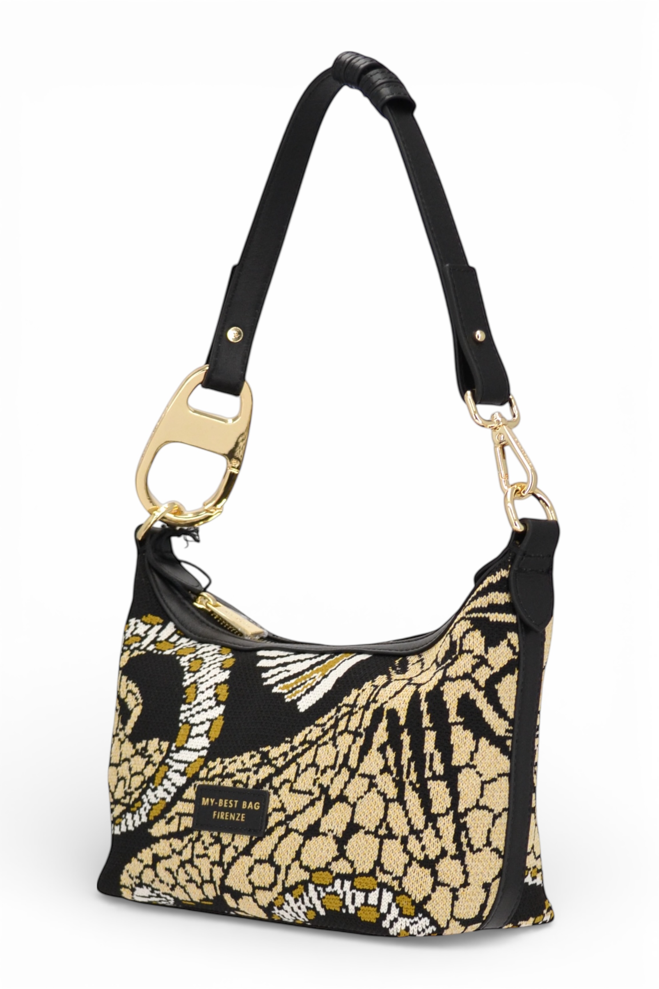 Tracolla in tessuto, fodera in tessuto con zip interna, chiusura esterna con zip, dettagli in pelle, tracolla corta e tracolla lunga, misure: 20x16x10 cm.